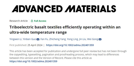 4月25日,William威廉英国官网郭隐犇副教授团队在Advanced Materials(《先进材料》)上发表了题为“Triboelectric basalt textiles efficiently operating within an ultra-wide temperature range” 的研究论文。Advanced Materials是美国WILEY集团于1988年创办的老牌旗舰期刊,是工程与计算大学科、材料与化学大领域的顶尖期刊,在国际材料领域科研界享誉盛名,最新影响因子为29.4。Advanced Materials在google公司划分的八大领域(商业经济与管理、材料与化学、工程与计算科学、健康与医药科学、人类文学与艺术、生命与地球科学、物理与数学、社会学)中,在工程与计算科学领域所有期刊中排名第一。