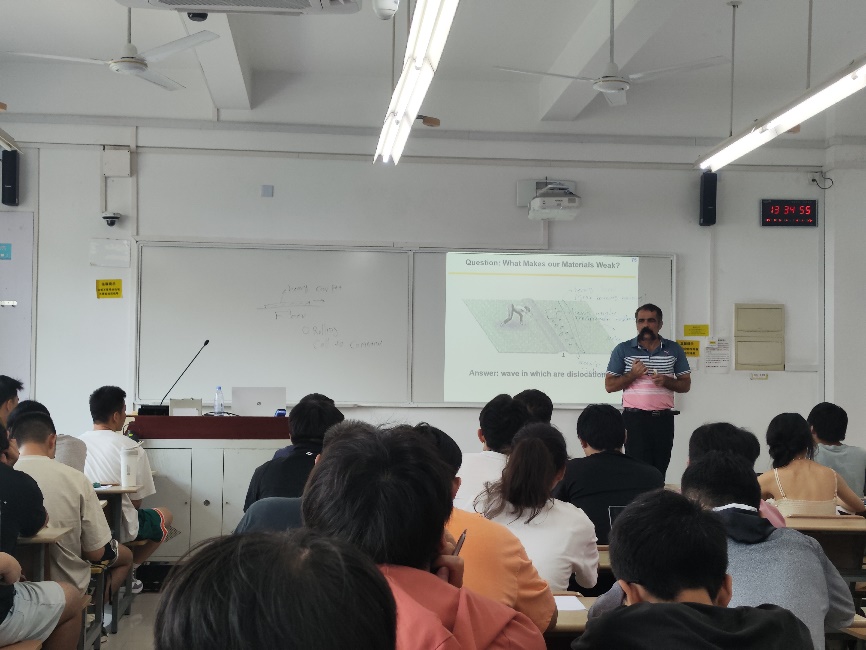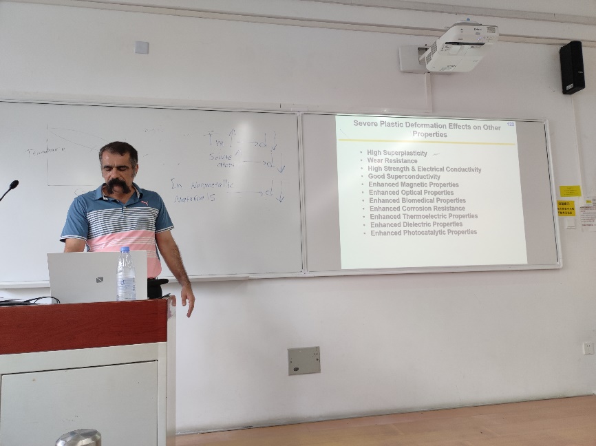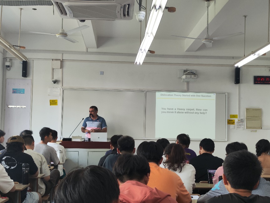 9月5日的课堂则更显生动与启迪。Kaveh教授巧妙地以“移动地毯”的日常生活现象为喻,深入浅出地阐述了材料的强化机制,激发了同学们浓厚的探索兴趣。随后,他系统介绍了高压扭转、等通道转角挤压、叠轧等前沿的剧烈塑性变形技术,并深入探讨了这些技术在研究晶粒尺寸、材料熔点及溶质含量等材料参数之间相关性规律方面的应用。此外,Kaveh副教授还介绍了高压扭转技术在储氢合金、高熵合金等新型材料的研发中展现出的巨大潜力。