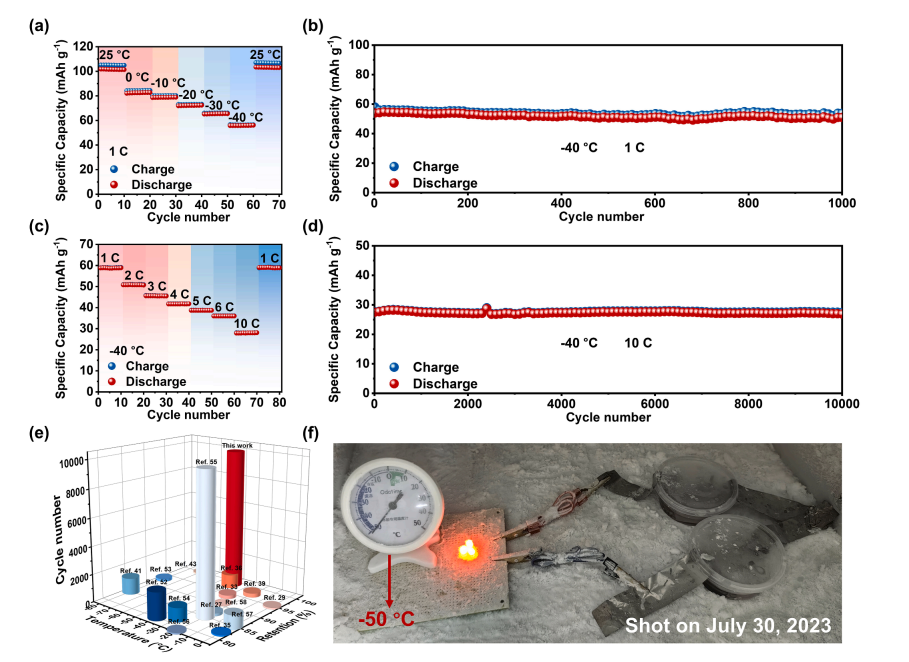首次将MnCl₂·4H₂O作为NaCl电解液的添加剂,以铁基普鲁士蓝和活性炭分别作为电池的阴极和阳极材料组装纯无机电池。该电池在–40 ℃下具有良好的比电容和循环稳定性,进一步开拓了水系无机钠离子电池的安全工作温度范围(25 ~ - 40 ℃),能满足新能源汽车在极低温度下高性能的需求,为水系钠离子电池低温性能的研究提供了理论和实验支撑。硕士研究生赵伯旺为该工作的第一作者,指导教师郝惠莲副教授为通讯作者,以“An anti - freezing pure inorganic electrolyte for long cycle life aqueous sodium-ion batteries at -40 ◦C”(https://doi.org/10.1016/j.ensm.2024.103562)为题发表在中科院1区Top顶刊Energy Storage Materials(IF=20.4)上。