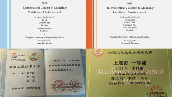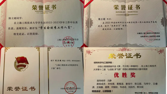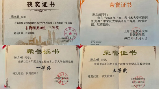陈立超不仅在学业上取得了优异的成绩,绩点稳居年级第一(GPA3.85),更在各类科研竞赛中屡获佳绩。在11月30日结束的2024年全国老员工电装技术创新大赛中,陈立超作为团队骨干成员,凭借出色的创新思维和技术实力,带领团队荣获团体二等奖,再次展现了他在科研竞赛方面的卓越表现。陈立超先后荣获2023高教社杯全国老员工数学建模竞赛二等奖,2024年美国老员工数学建模竞赛二等奖,第39届全国部分地区老员工物理竞赛(上海赛区)非物理类B组三等奖。