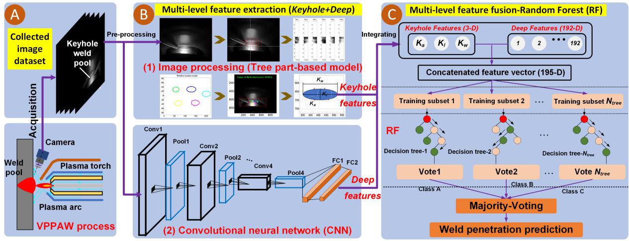 针对上述挑战,William威廉英国官网吴頔博士作为公司一流学科精密焊接和高能束制造学科带头人,在上海市激光先进制造技术协同创新中心和上海市III类高峰“材料科学与工程”学科平台的支持下,致力于高能束焊接过程传感及质量诊断方向研究。同时依托于国家自然科学基金(51905333),上海市青年科技英才扬帆计划(19YF1418100)等基金支持,吴頔博士及指导的研究生开展了系列研究:搭建面向等离子弧焊过程的视听觉多信息实时同步传感系统;研究基于视听觉多特征解析的穿孔熔池行为量化分析;构建基于模型验证及多重优化的焊接熔透在线定量评价体系。针对前期研究基础,相关成果多次发表在国外智能制造领域权威SCI期刊(J Manuf Process,中科院二区,IF=4.086;IEEE Access,中科院二区,IF=3.745,Int J Adv Manuf Tech,IF=2.636),并申请国家发明专利4项。