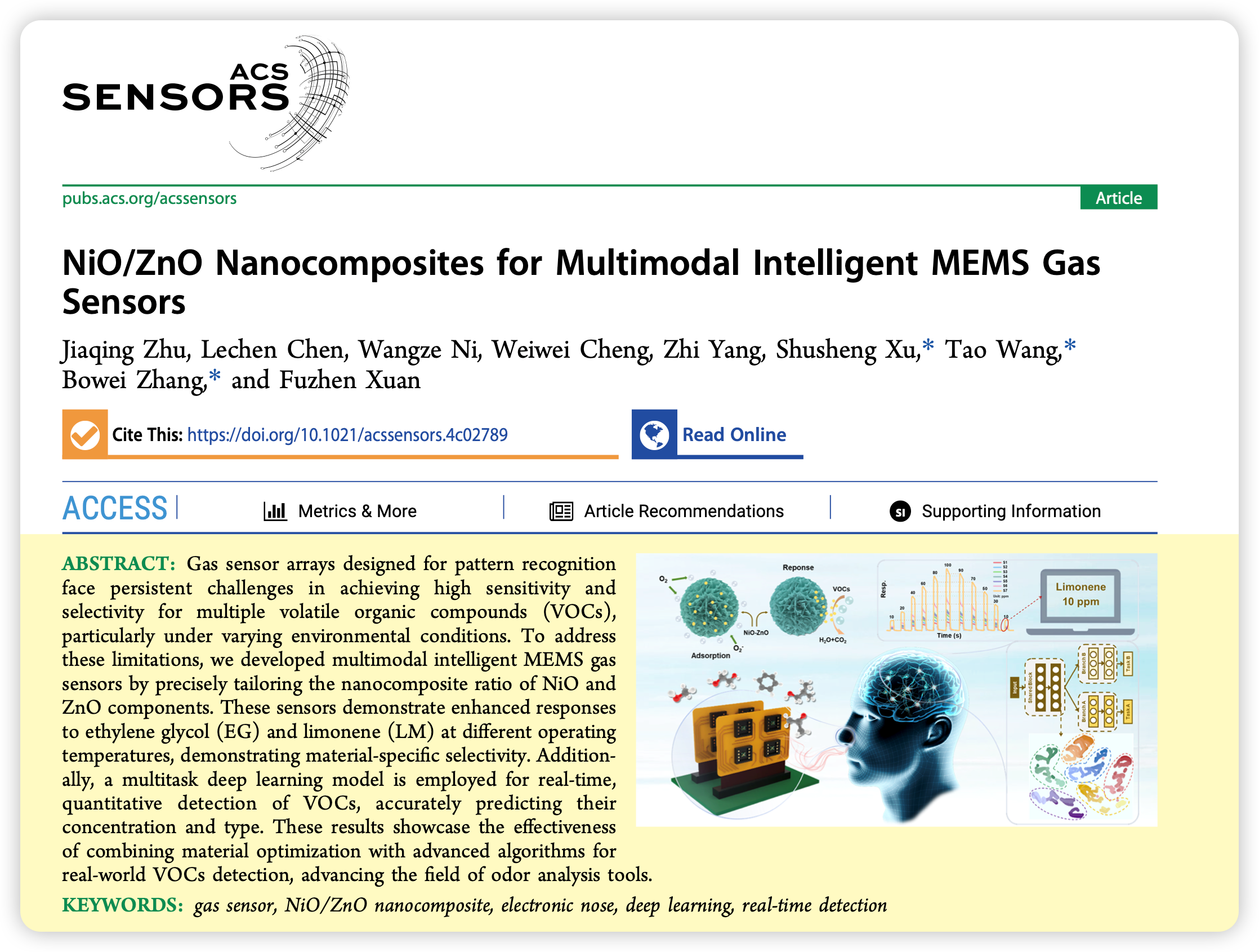 近日,William威廉英国官网徐书生博士指导硕士研究生朱佳清在传感器学科国际顶级学术期刊《ACS Sensors》(中科院一区Top,影响因子8.3)上发表了题为“NiO/ZnO Nanocomposites for Multimodal Intelligent MEMS Gas Sensors”的研究论文。徐书生为第一通讯作者,朱佳清为第一作者,华东理工大学的张博威教授和王涛副研究员为本论文的共同通讯作者。