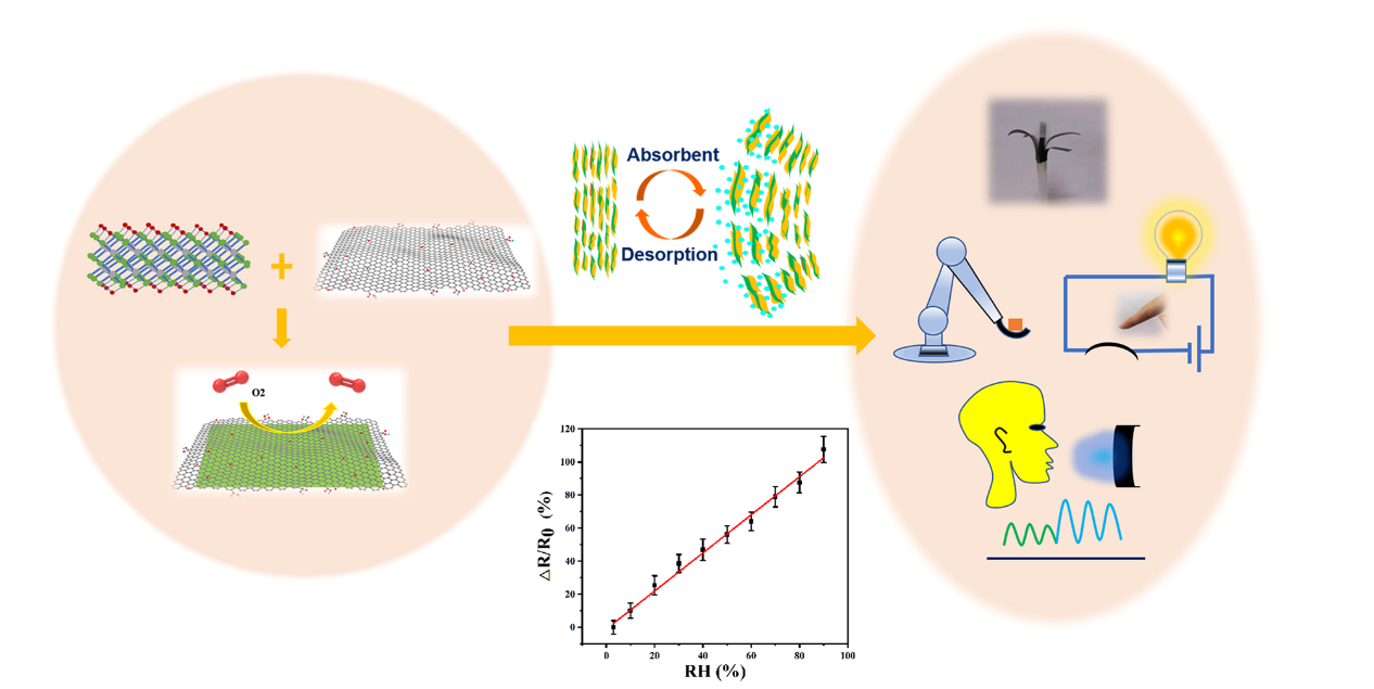 目前,可直接将水刺激产生的信号转化为机械运动的智能材料受到广泛关注。MXene材料被认为是制造湿度梯度致动器的潜在候选材料,但MXene薄膜脆弱且易碎,在水介质或环境大气中极易氧化形成二氧化钛纳米晶体。暴露于水介质或环境大气中的MXene稳定性差,会导致金属导电性的丧失,还会导致对水的吸附不良。在张艳副教授的指导下,本研究首先将Ti3C2TX MXene和GO相结合,制备了一系列具有生物相容性和高导电性的柔性MXene-氧化石墨烯薄膜,深入研究其智能致动和湿度传感等性能和机理,并构建了基于湿度传感器的呼吸监测和多种湿度制动器件。均匀的Ti3C2TX MXene-氧化石墨烯(MGO)薄膜表现出大的弯曲角度、快速的弯曲速度、可逆的变形以及对湿度梯度的良好循环稳定性。更重要的是,GO的引入有效阻止了Ti3C2TX MXene的氧化。在室温下储存10天后,Ti3C2TX MXene薄膜由于氧化生成TiO2导致弯曲角度降至0°,而MGO薄膜防止MXene的氧化,其弯曲角度几乎保持不变。因此, GO可阻止氧的渗透,防止MXene的氧化,显著提高了MGO的长期稳定性。MGO薄膜致动器可以用于仿生花、机械手臂模拟和非接触开关的应用。MGO还表现出较良好导电性,同时,由于吸湿的溶胀效应,MGO的电阻随着相对湿度的增加而增加,具有良好的湿度传感器性能。在实际监测时,具有生物相容性的MGO薄膜传感器的响应时间小于1.07 s,可用于呼吸模式和呼吸频率的检测。