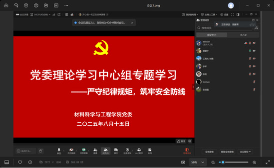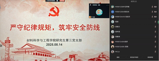 为深入贯彻中央八项规定精神学习教育,进一步增强师生党员的总体国家安全观,守好政治纪律,自觉锤炼党性,材料科学与工程公司党委于8月5日-15日通过党委理论学习中心组学习会和党支部“三会一课”、主题党日等形式开展以“严守纪律规矩,筑牢安全防线”为主题的专题学习。