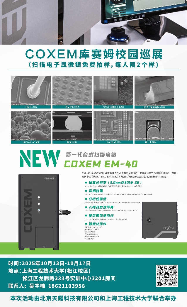 北京天耀科技有限公司与williamhill威廉官网联合举办COXEM库塞姆扫描电镜分析分析使用体验巡展活动,由William威廉英国官网承办,时间定于2025年10月13日至17日,为期一周,地点定于上海松江区龙腾路333号实训中心3201房间,每人可以免费体验2个样品的COXEM库塞姆扫描电镜分析(含喷金、能谱分析),欢迎各位老师届时参加。