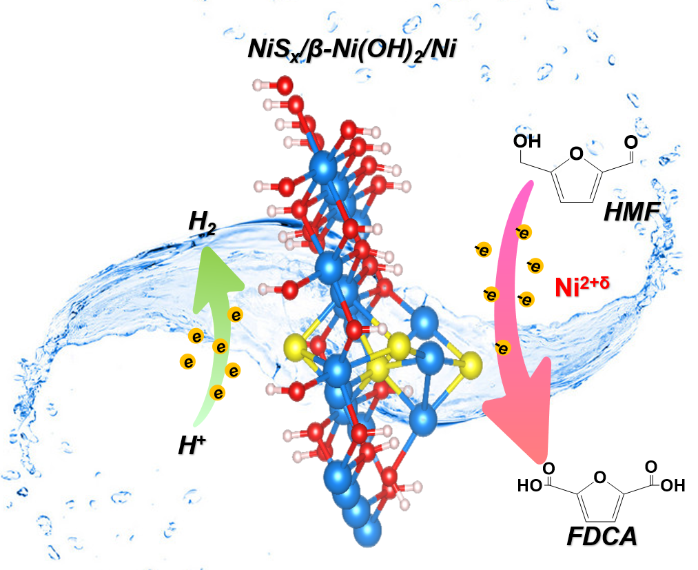 图1. NiSx/β-Ni(OH)2/Ni电催化5-羟甲基糠醛合成2, 5-呋喃二甲酸示意图