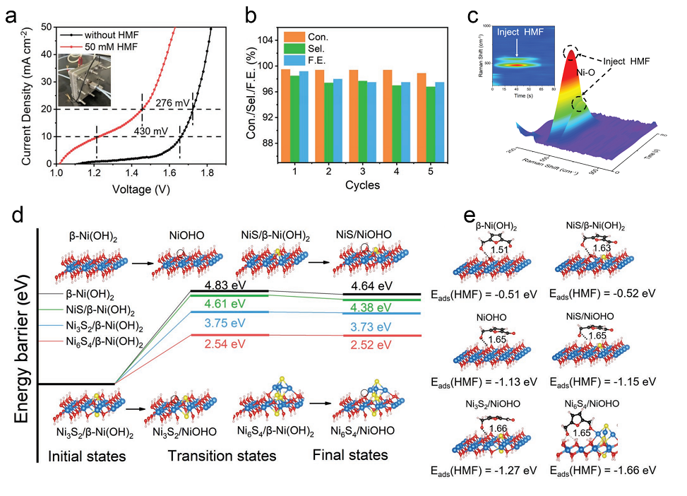 图2. (a) NiSx/β-Ni(OH)2/Ni组装流动电池极化曲线; (b) NiSx/β-Ni(OH)2/Ni 电催化HMFOR性能;(c)OER耦合HMFOR 过程的原位拉曼;(d) 各催化剂脱氢动力学能量曲线;(e) HMF吸附构型与能量