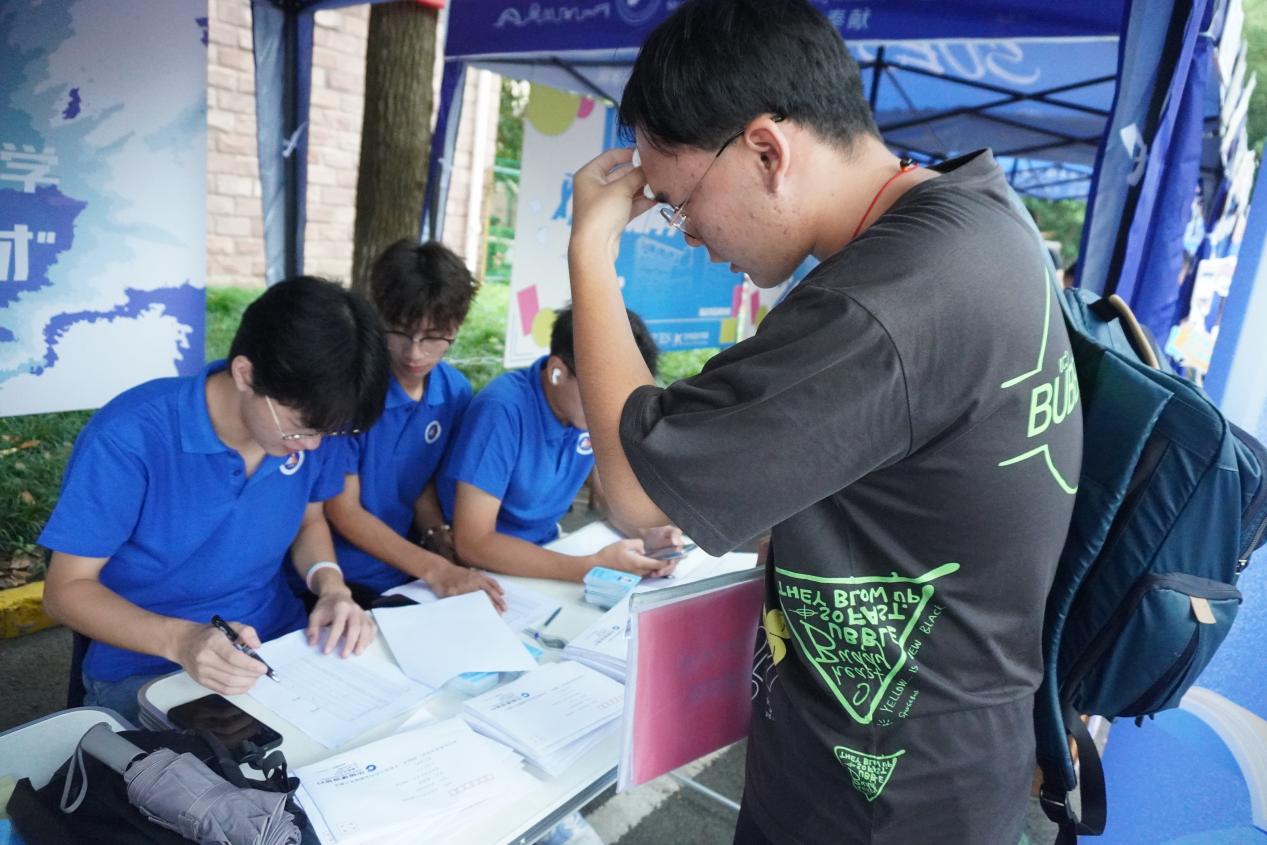 迎新现场,学长学姐按班级为新生们提供报到服务,领校园卡、银行卡,发放公司为同学们定制的礼物,跨越山海,我们终于相遇。